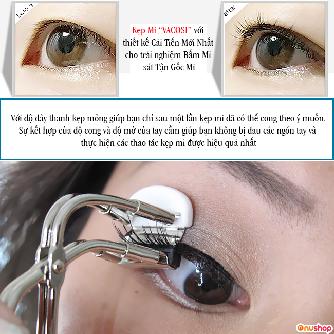- Thông thường mascara khác khó sử dụng cho vùng đầu và đuôi mắt nhưng Bấm mi thế hệ mới Vacosi Pro Artist Curler thì khác, đôi mi cong đều tự nhiên chỉ sau một lần kẹp.