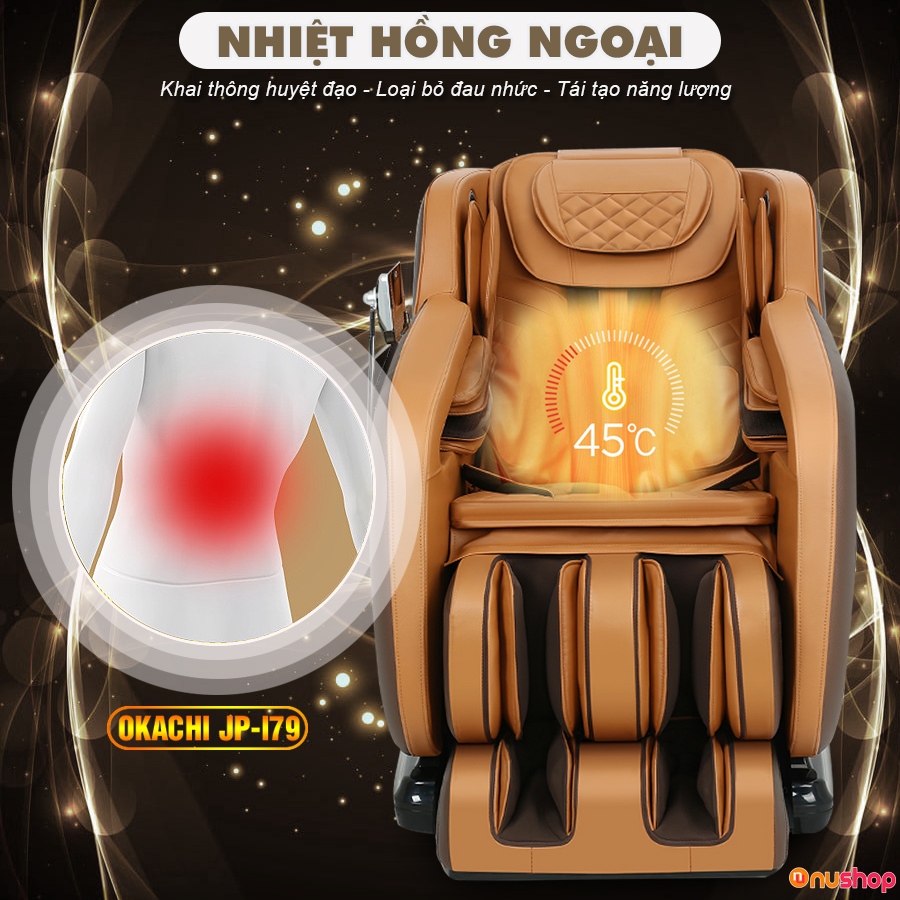 Nhiệt hồng ngoại có tác dụng rất lớn trong việc thúc đẩy máu lưu thông, loại bỏ đau nhức, căng cơ, cứng khớp, mệt mỏi. Vì thế khi sử dụng tính năng nhiệt hồng ngoại trên Ghế massage toàn thân OKACHI Luxury JP-I79 cơ thể bạn sẽ khỏe khoắn hơn.