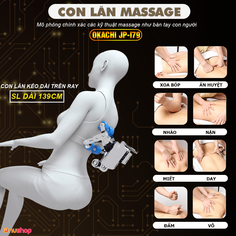 Ghế massage toàn thân OKACHI Luxury JP-I79 trang bị trục hình SL có chiều dài 139cm. Nhờ thiết kế này mà toàn bộ vùng cột sống của người dùng được ôm sát, giúp con lăn tác động chính xác đến từng huyệt đạo, tập trung vô những vùng đau nhức.
