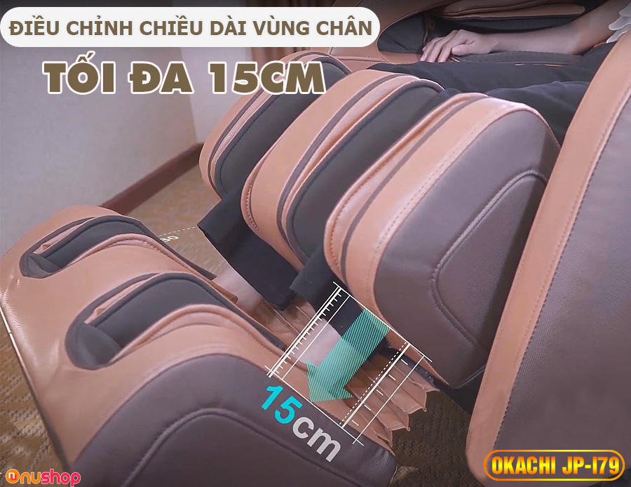 OKACHI Luxury JP-I79 thiết kế bộ phận massage chân có thể kéo giãn để điều chỉnh phù hợp chiều cao người dùng. Khu vực massage chân được tích hợp hệ thống túi khí kết hợp con lăn gan bàn chân, tác động đồng đều và chuyên sâu không bỏ sót vị trí nào.