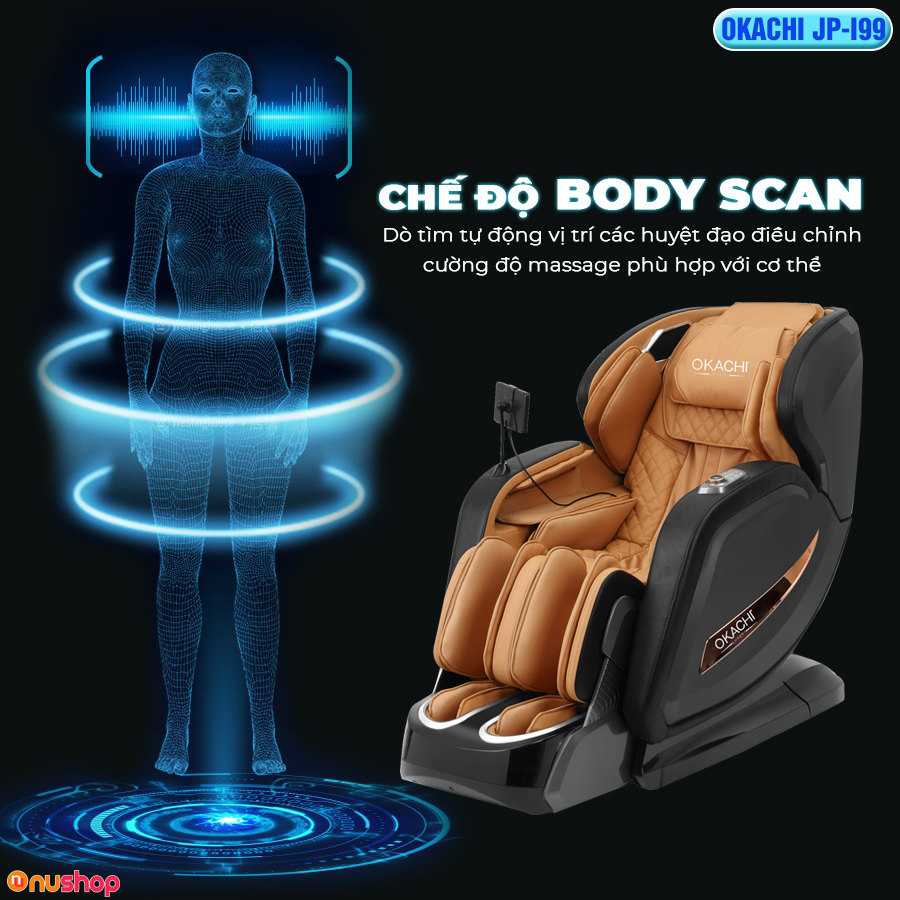 Nhờ công nghệ A.I – trí tuệ nhân tạo, Ghế massage toàn thân OKACHI LUXURY JP-I99 được tích hợp chức năng Body Scan quét tự động vóc dáng người dùng. Từ đó thiết lập bản đồ khu vực chính cơ thể người dùng, xác định các điểm quan trọng cổ, vai gáy, lưng, thắt lưng… giúp chăm sóc chuyên sâu hơn.