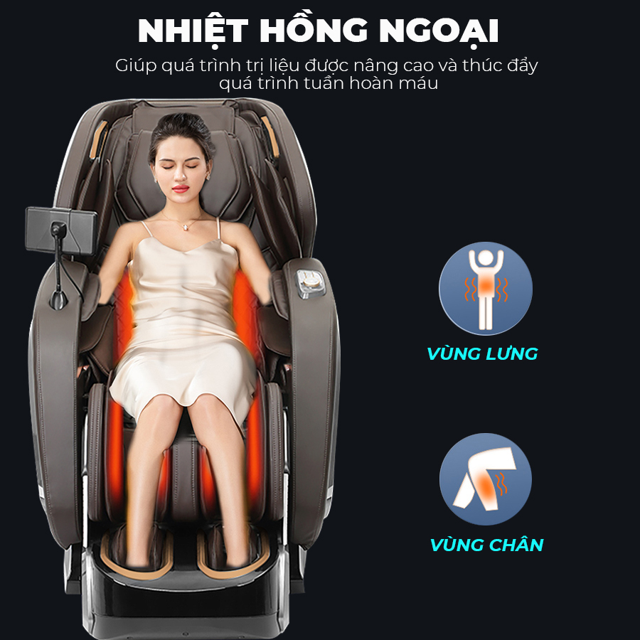 Với hệ thống nhiệt vùng lưng – bắp chân – bàn chân giúp quá trình trị liệu được nâng cao hơn, thúc đẩy tuần hoàn máu, sưởi ấm cơ thể trong mùa đông. Được trang bị cảm biến nhiệt thông minh, không gây cảm giác bức bối, đổ mồ hôi khi sử dụng.