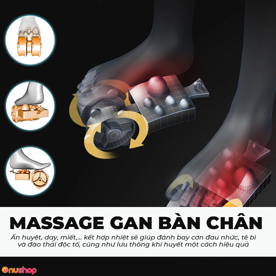 Ngoài hệ thống túi khí massage toàn diện đôi chân thì con lăn chăm sóc gan bàn chân là tính năng nổi bật. Những động tác ấn huyệt, day, miết,… kết hợp nhiệt và túi khí giúp đánh bay nhức mỏi, tê bì, đào thải độc tố, khí huyết lưu thông hiệu quả.