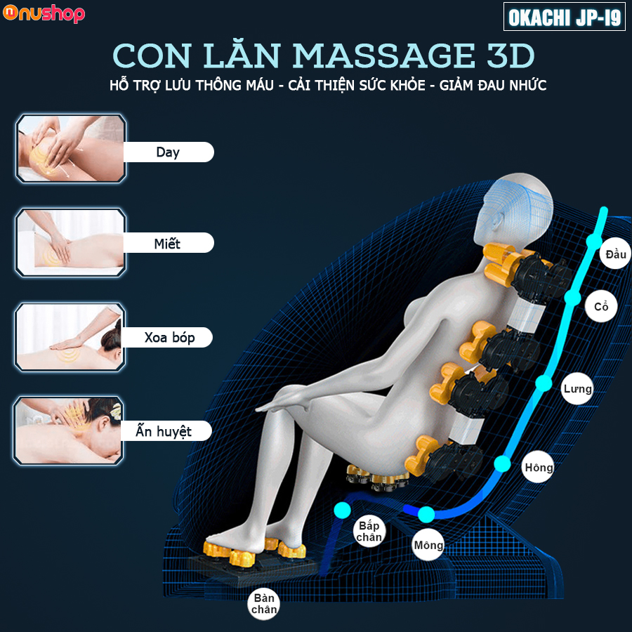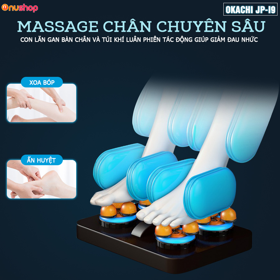OKACHI LUXURY Star JP-I9 cho người dùng trải nghiệm cảm giác massage chuyên sâu, nhờ hệ thống con lăn cố định bố trí dài từ cổ đến chân. Động tác xoay, ấn huyệt, nhào nặn… của con lăn kích thích vào các điểm huyệt đạo giúp khí huyết lưu thông, giảm đau nhức.
