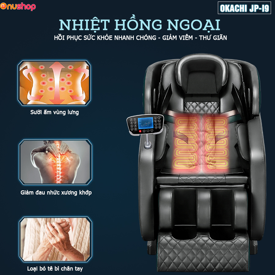 Ghế massage toàn thân OKACHI LUXURY Star JP-I9 (xám) bố trí nhiệt hồng ngoại ở vùng lưng và chân. Nhiệt hồng ngoại có tác dụng lớn trong việc phòng và chữa đau nhức xương khớp, thư giãn hệ thần kinh, xoa dịu cảm giác tê bì.