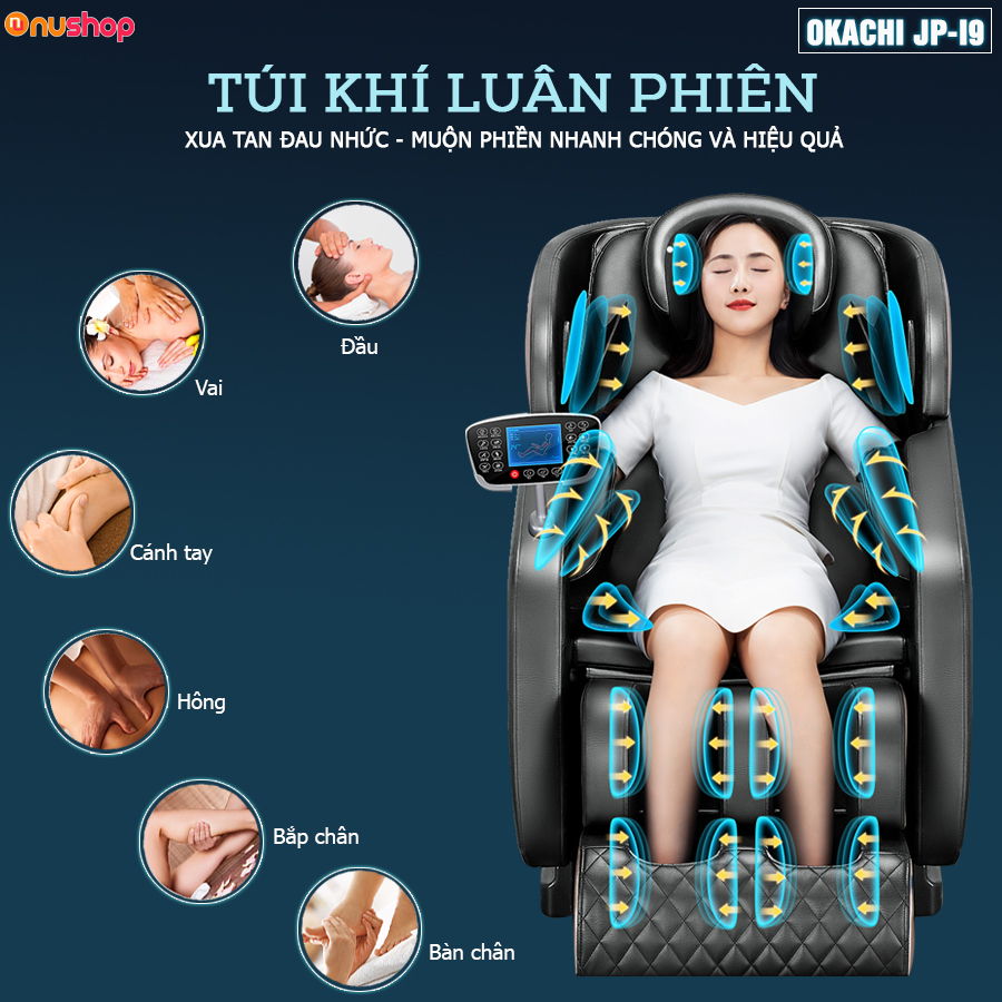 Bên cạnh các túi khí phân bổ ở vai, cánh tay, hông, bắp chân, bàn chân như các loại ghế khác thì OKACHI LUXURY Star JP-I9 còn được thiết kế thêm túi khí ở vùng đầu. Các túi khí này tạo áp lực tác động lên các những nhóm cơ, làm mềm cơ, chống căng cứng cơ.