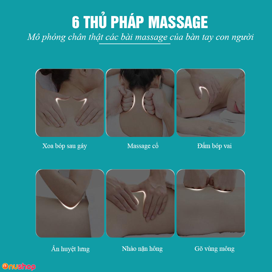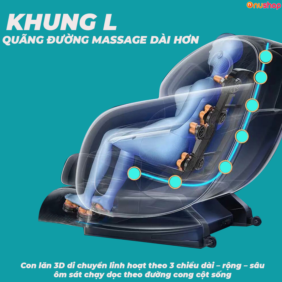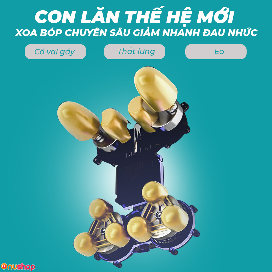 Con lăn massage 3D thế hệ mới, cố định tại các điểm quan trọng trên cơ thể, phân bổ dọc theo đường cong cột sống. Con lăn thiết lập trên khung hình L, ôm sát cơ thể massage linh hoạt bao gồm cổ vai gáy, lưng, eo. Không chỉ đem lại cảm giác thoải mái, cảm nhận sự chân thật như bàn tay con người đang thao tác mà người sử dụng sẽ giảm đau nhức nhanh chóng nhờ các kỹ thuật chuyên nghiệp xoa bóp, ấn huyệt, nhào, đấm, vỗ,…