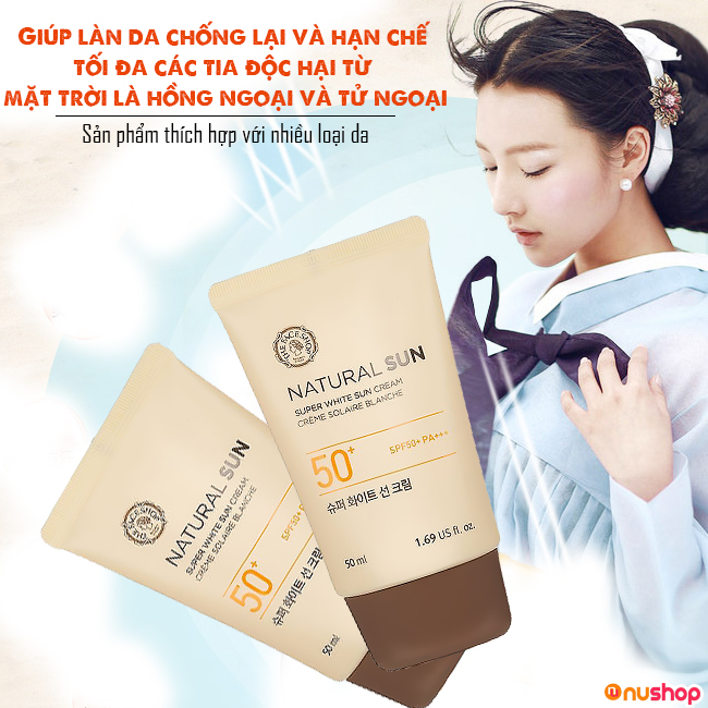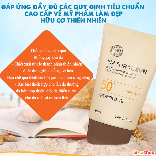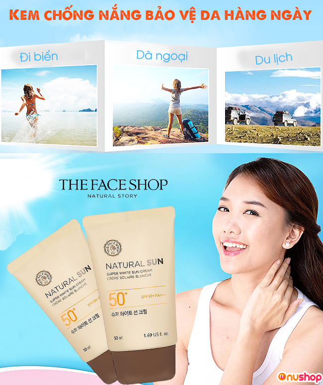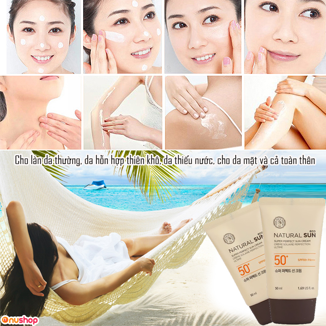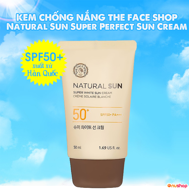 Nhưng, lựa chọn loại sản phẩm nào phù hợp với da cũng là điều quan trọng đấy! NUSHOP giới thiệu đến bạn Kem chống nắng THE FACE SHOP Natural Sun Super Perfect Sun Cream xuất xứ từ Hàn Quốc, độ chống nắng SPF 50 PA+++, thích hợp cho da thường, da hỗn hợp, da thiếu nước. Đặc biệt, sản phẩm này thích hợp dùng cho cả da mặt và toàn thân nhé!