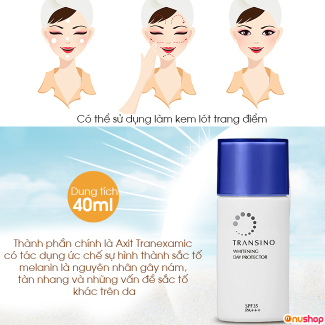 - Kem chống nắng Transino Whitening Day Protector có thể làm kem lót trang điểm, bạn thoải mái sử dụng kết hợp các mỹ phẩm làm đẹp khác.