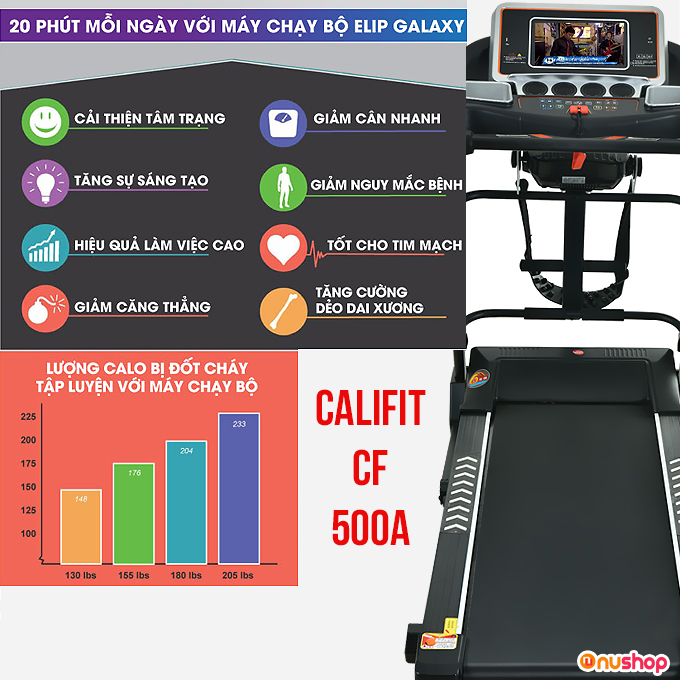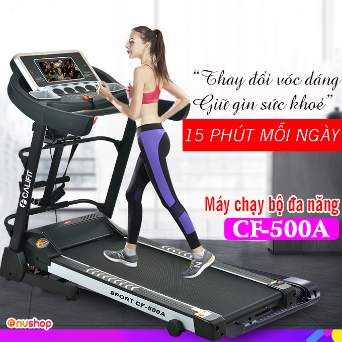 Chạy bộ là cách rèn luyện thể lực, cải thiện và duy trì vóc dáng tuyệt vời. Chạy bộ lại là phương pháp tập đơn giản nên bất kỳ ai cũng có thể lựa chọn môn thể thao này. Nhưng do thời gian, công việc, môi trường, tính an toàn mà bạn không thể chạy bộ ngoài trời hoặc công viên? Vậy, Máy chạy bộ đa năng CALIFIT CF-500A sẽ giúp đỡ bạn. Đây là sản phẩm hiện đại, kiểu dáng tân thời được nhiều người tin dùng cũng như bán chạy tại cửa hàng. Với động cơ được sản xuất theo tiêu chuẩn châu Âu, thời gian bảo hành tận 5 năm, thì máy chạy bộ này hoàn toàn thích hợp với các gia đình Việt.
