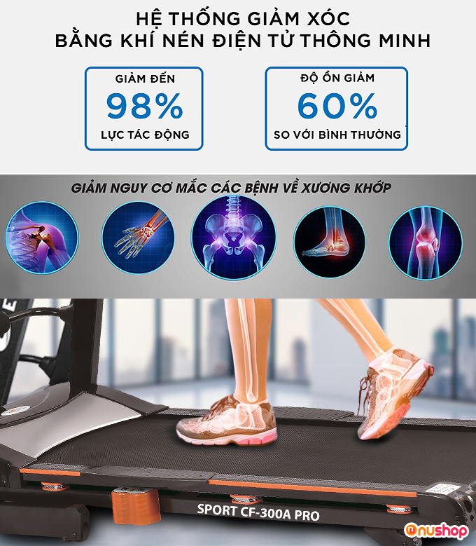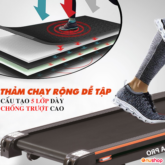 Bộ phận giảm chấn lò xo thép đôi, cùng đệm lót cao su mềm mại không chỉ đem lại sự an toàn cho hệ xương khớp của bạn mà còn tạo sự chắc chắn và êm ái khi chạy.