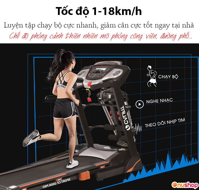 - Màn hình hiển thị 7inch cảm ứng hiển thị: thời gian, tốc độ, nhịp tim mạch...