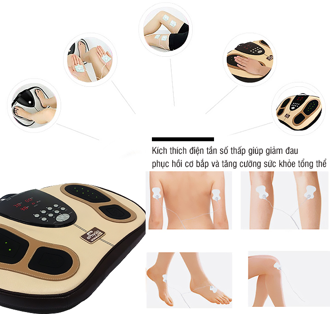 - Ngoài việc sử dụng máy cho bàn chân bạn còn có thể kết hợp các miếng dán vào bắp chân, bàn tay, bắp tay, đùi, cổ, vai, lưng để điều trị đau nhức và thư giãn.