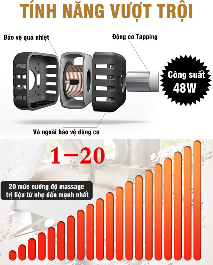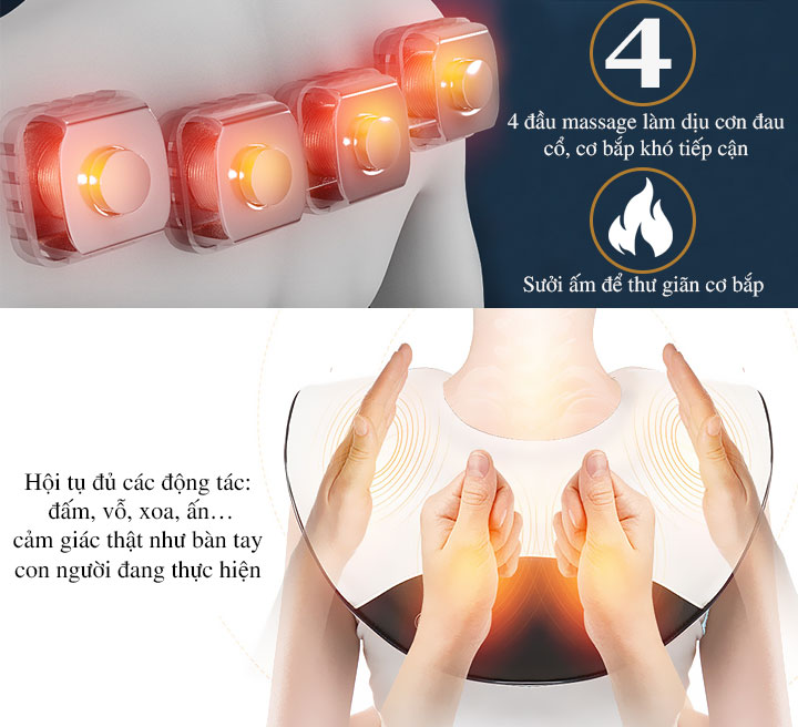 - Xoa bóp chuyên sâu với 4 đầu massage được thiết kế đặc biệt, khả năng tiếp xúc trực tiếp và chuyên nghiệp hơn như xoa, ấn, bóp, nhào, nặn…kích thích các huyệt đạo, hệ thần kinh, giải phóng sự đau nhức, mệt mỏi, căng cứng cơ…