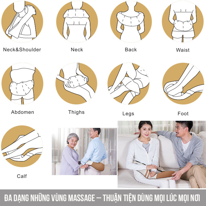 - Thích hợp massage vùng cổ, vai, gáy, lưng, bắp chân, đùi, hông, mông.