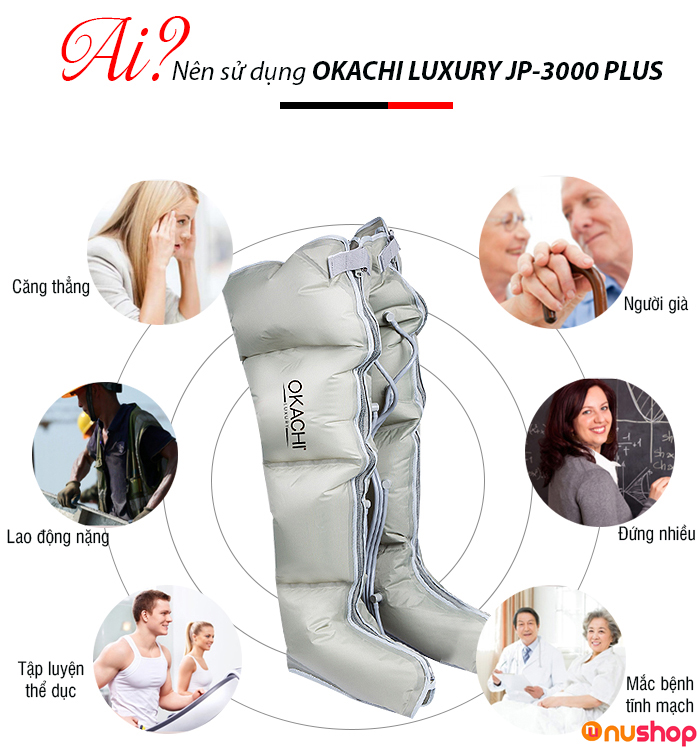 - Bộ sản phẩm OKACHI LUXURY JP-3000 Plus (Pin sạc) sử dụng từ đùi đến bàn chân. Bạn có thể mua kèm thêm phụ kiện dùng cho cánh tay, eo để sử dụng.