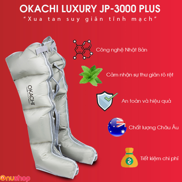 Máy nén ép trị liệu suy giãn tĩnh mạch OKACHI LUXURY JP-3000 Plus (Pin sạc) chính hãng, 100% chất lượng lại có giá tốt được NUSHOP phân phối tại thị trường Việt Nam. Với thời gian bảo hành 12 tháng bạn hoàn toàn có thể yên tâm sử dụng sản phẩm hoặc biếu tặng người thân của mình.