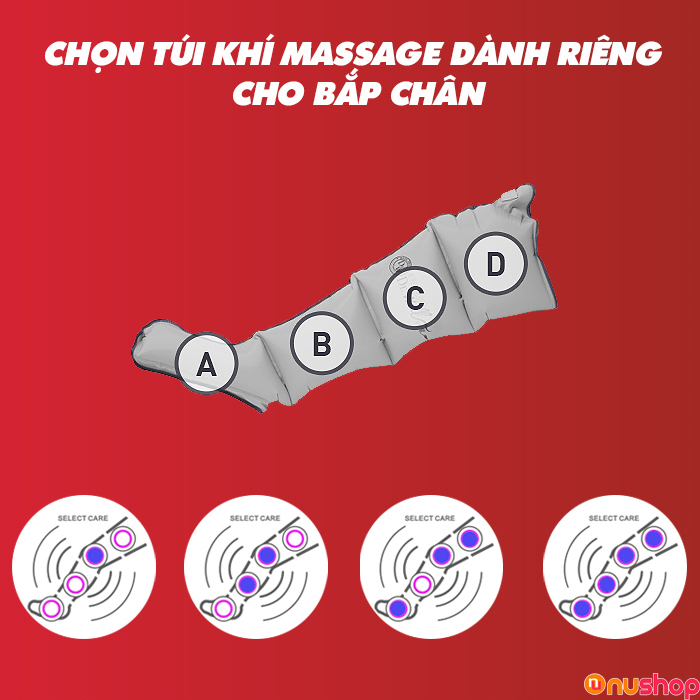 - Chức năng chăm sóc chuyên sâu và tối ưu hóa, với 4 khoang khí có thể bật hoặc tắt sử dụng độc lập. Nhờ vậy người dùng có thể lựa chọn được khoang khí phù hợp với vùng cơ thể cần chữa trị.