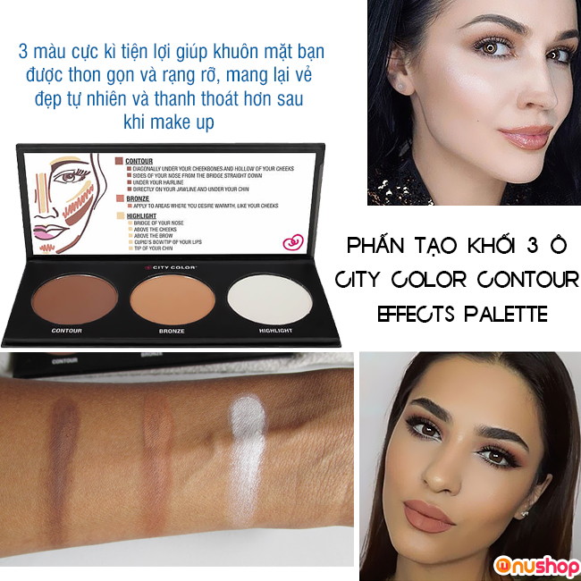 Muốn tạo lớp trang điểm sắc sảo và ấn tượng thì tạo khối chính là bước make up không thể bỏ qua. Tuy nhiên rất nhiều chị em còn lúng túng với bước trang điểm này, đặc biệt là lựa chọn loại phấn tạo khối nào tốt nhất. Vì vậy, NUSHOP sẽ giới thiệu mọi người Phấn tạo khối 3 ô City Color Contour Effects Palette hiện đang được đánh giá cao và yêu thích nhất hiện nay. Bảng màu 3 ô phong phú,được bán với giá bình dân sản phẩm có rất nhiều công dụng, thoải mái đem theo đi chơi xa, đi làm, du lịch, công tác.