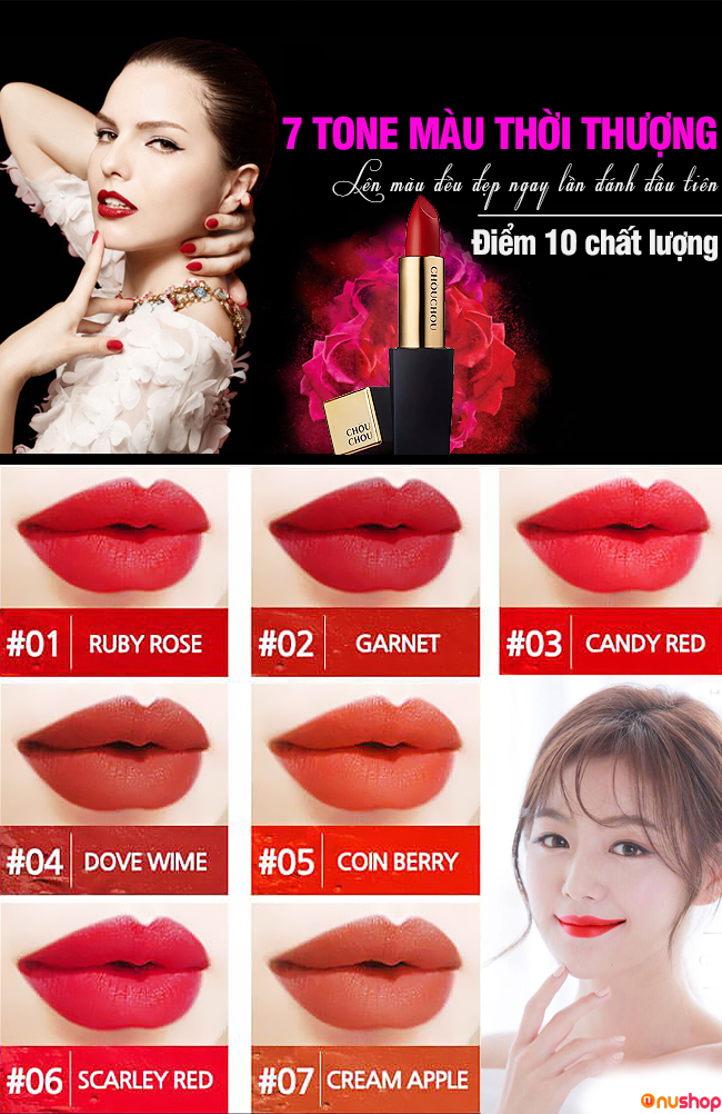 Son Chou Chou Desire hiện đang được các tín đồ làm đẹp yêu thích, với mức giá phù hợp túi tiền. Để mua sản phẩm chính hãng bạn nên đến với nushop, tránh mua phải hàng kém chất lượng, hàng fake ở những nơi kém uy tín mà lại hại đến đôi môi của mình nhe!