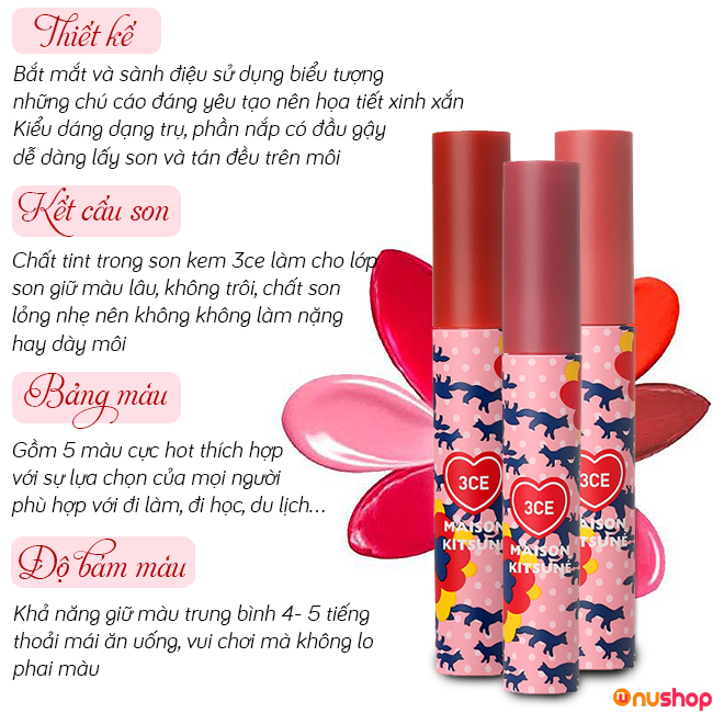 Hy vọng qua những thông tin hữu ích mà chúng tôi cung cấp về dòng Son kem lì 3CE Maison Kitsune Velvet Lip Tint bạn đã có thể chọn cho mình màu sắc ưng ý. Bạn hoàn toàn yên tâm về chất lượn, giá thành khi mua son tại NUSHOP nhé!