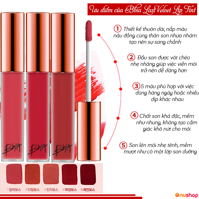 - Khác với nhiều dòng son kem lì khác, Bbia Last Velvet Lip Tint là sự kết hợp giữa 2 dòng son đó là son lì và son tint khi đánh lên môi lần đầu tiên bạn sẽ cảm nhận ngay độ mướt, mịn, không vón cục, dễ tán đều. Sau khi tô son trên môi sẽ có thêm một lớp bóng nhẹ và biến mất khi bạn bặm môi vài lần, càng để lâu thì độ lì của son càng tăng. Son d9ug1 chất velvet, mịn như nhưng, không làm lộ khuyết điểm vân môi, không gây nặng môi.
