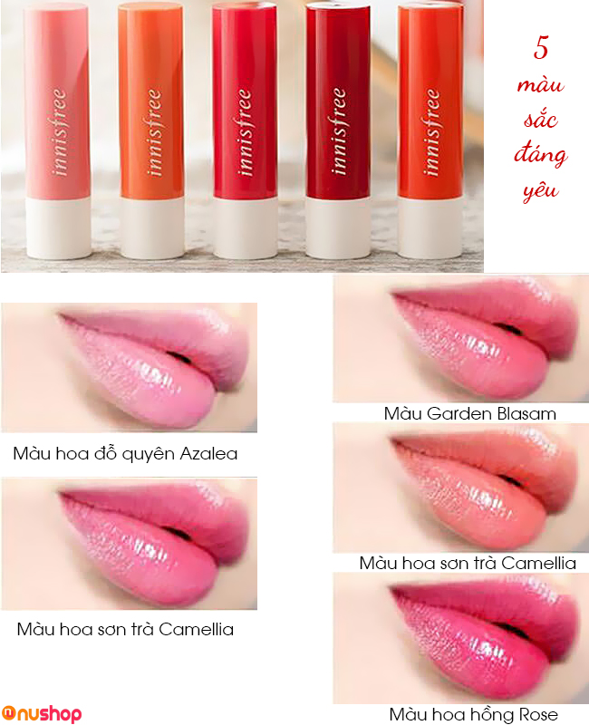 Innisfree Glow Eco Flower Tint Balm có tổng cộng 5 màu bạn dễ dàng chọn lựa theo sự yêu thích: