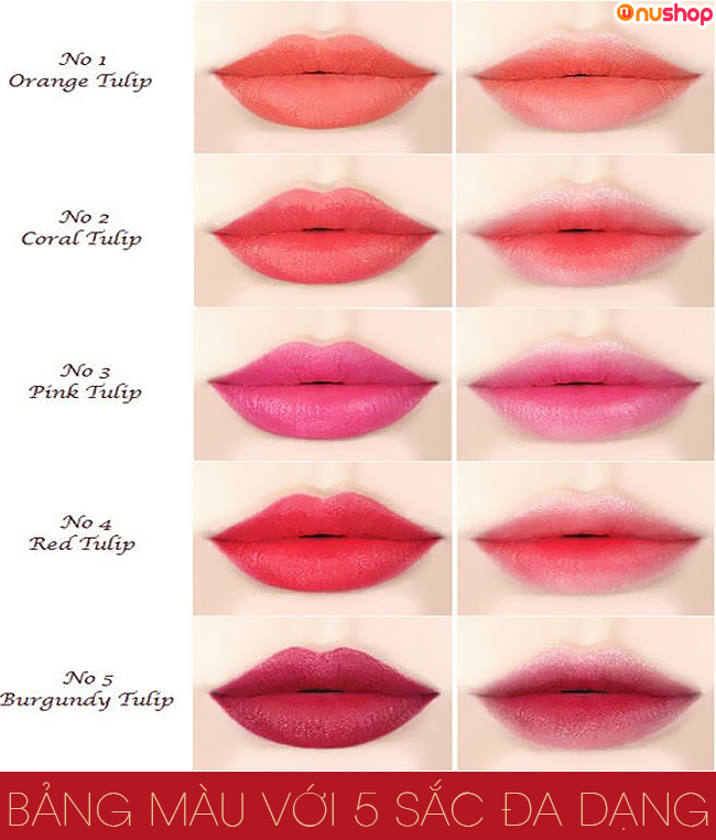 - Bộ sưu tập này gồm 5 màu sắc lấy cảm hứng từ 5 loài hoa tulip cực kỳ “Hot trend” tôn màu da, phù hợp nhiều làn da của chị em:
